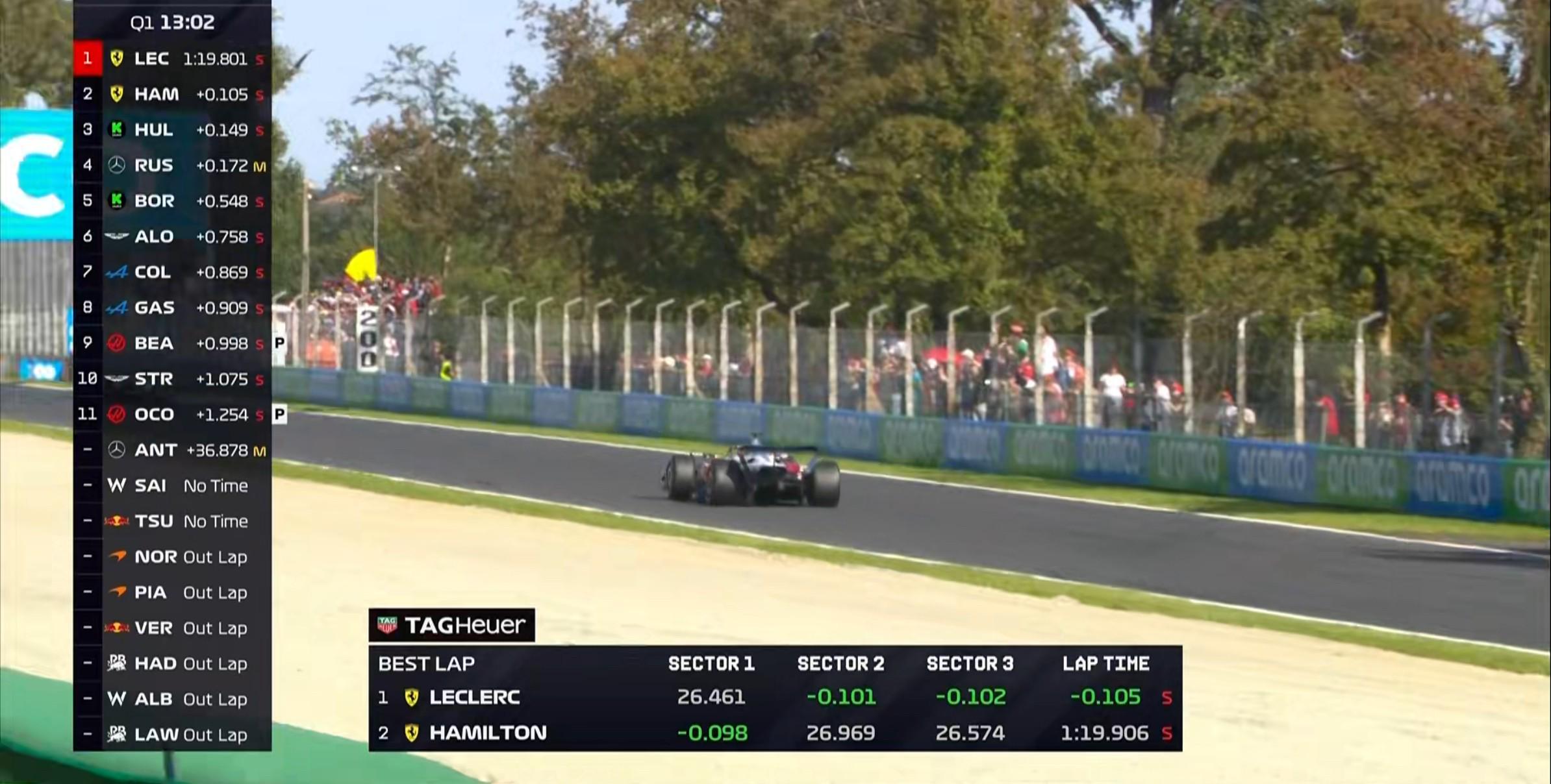 两台法拉利较早做出成绩,勒克莱尔暂居榜首,汉密尔顿排在第2,两台梅赛德斯则使用中性胎开始飞驰;