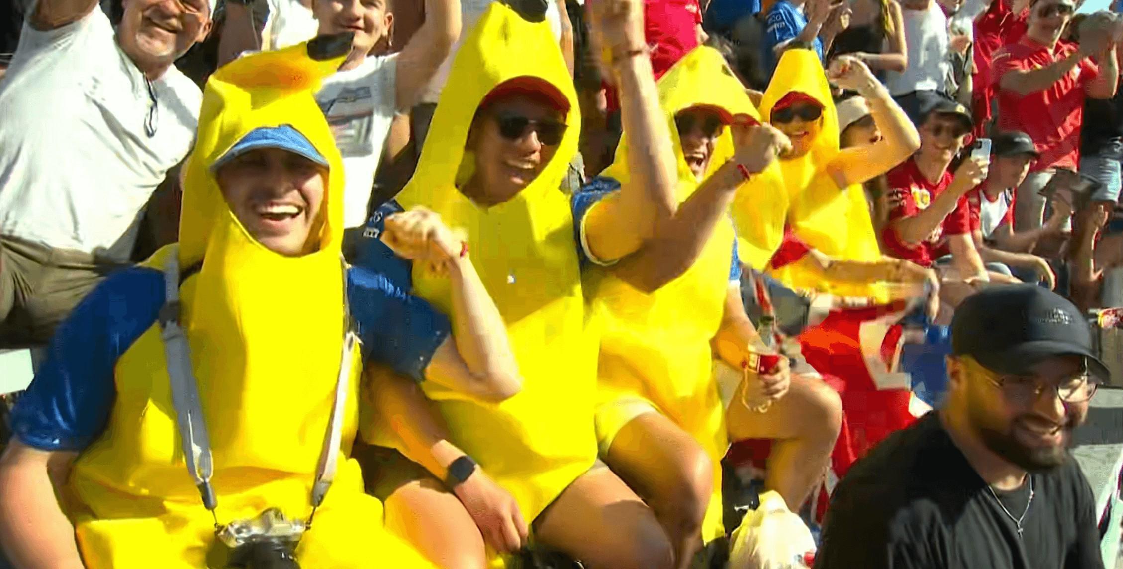 车迷身穿勒克莱尔曾在直播中穿过的“黄色香蕉服”,现场应援法拉利的主场车手;